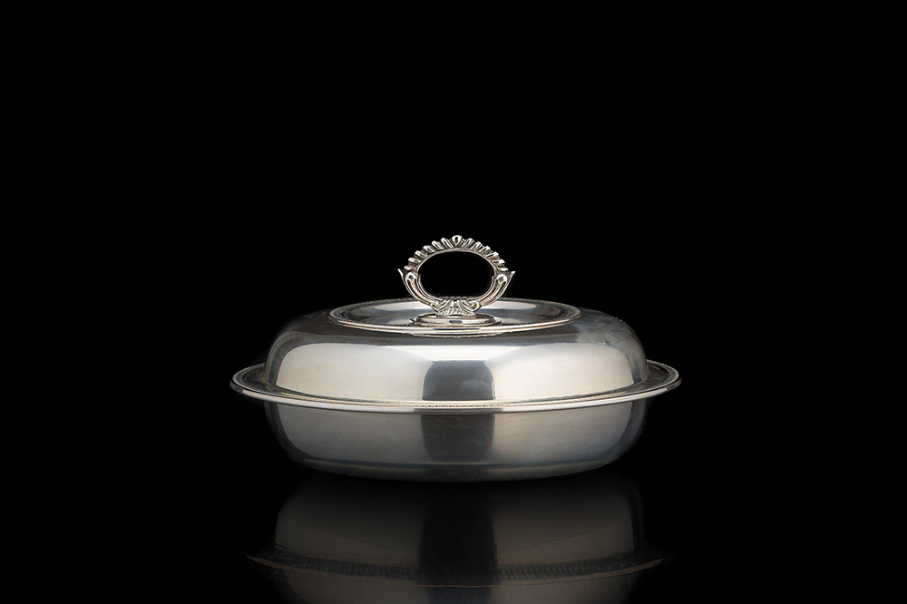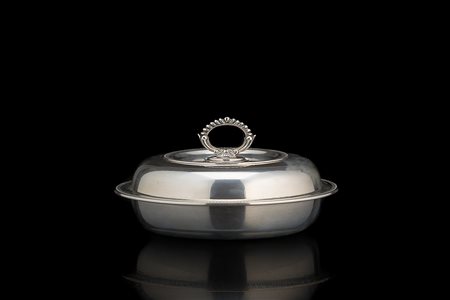 Legumiera in argento di forma circolare con superficie liscia e bordure decorate a palmette; presa ad anello godronato. Milano, metà secolo XX (d. cm 24 ca.) (g 915 ca.) (lievi difetti)