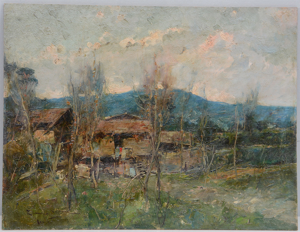 Romolo Leone "Paesaggio con cascina" olio su tavola (cm 34x45) firmato e locato Napoli in basso a sinistra