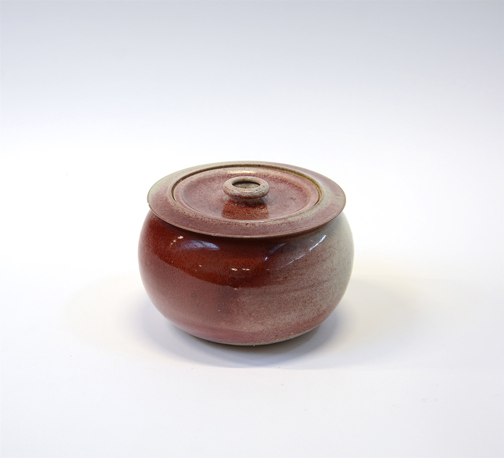 Contenitore con coperchio in grès ceramico smaltato in grigio beige e vinaccia. Marcato sotto la base "CLA". Italia, anni 60 (h cm 11)