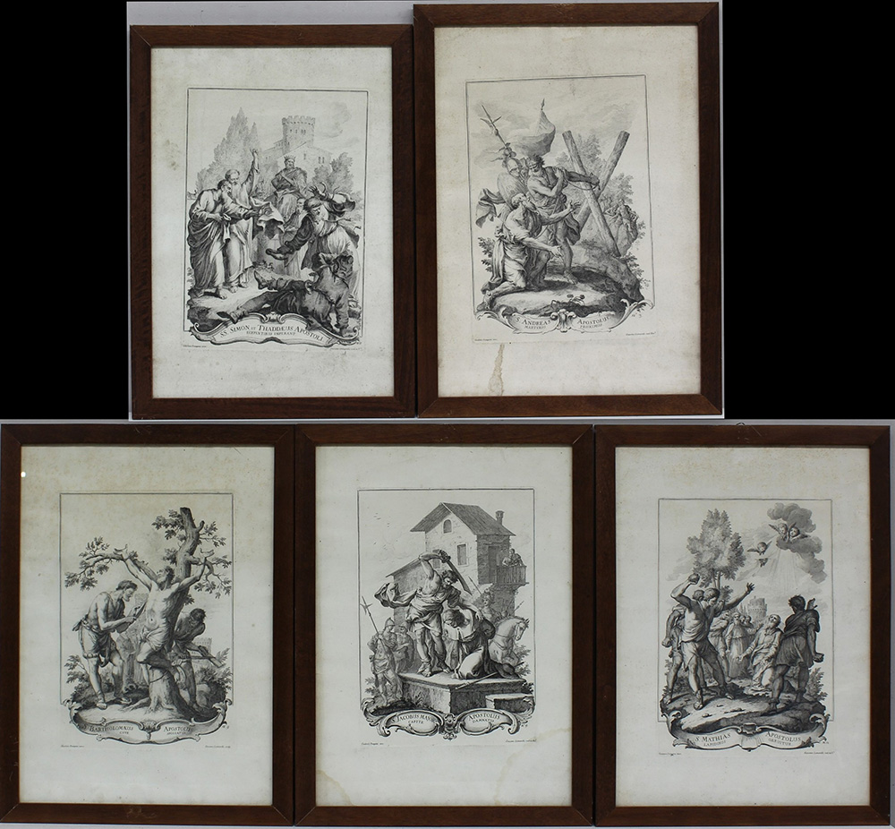 Lotto composto da cinque incisioni (cm 35,5x24,5) in bianco e nero raffiguranti scene agiografiche (lievi fioriture). In cornici.
