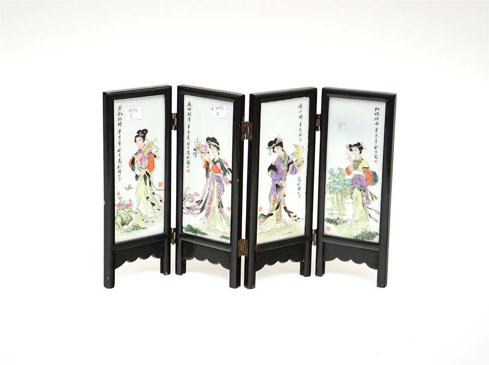 Piccolo paravento a quattro ante in porcellana raffiguranti figure femminili con calligrafia e sigilli (difetti)