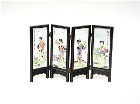 Piccolo paravento a quattro ante in porcellana raffiguranti figure femminili...