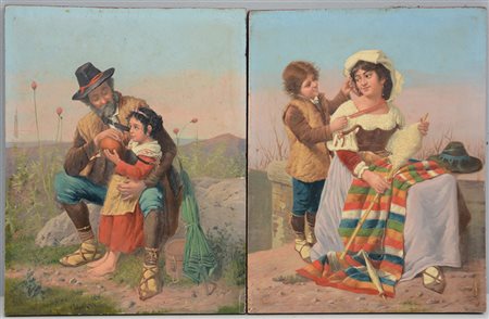 Scuola romana del secolo XIX " Figure popolari" coppia di dipinti ad olio su...