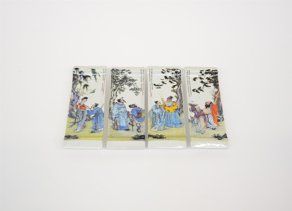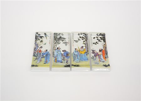 Quattro vassoi piccoli in porcellana policroma decorati con figure, calligrafia e sigillo (difetti)