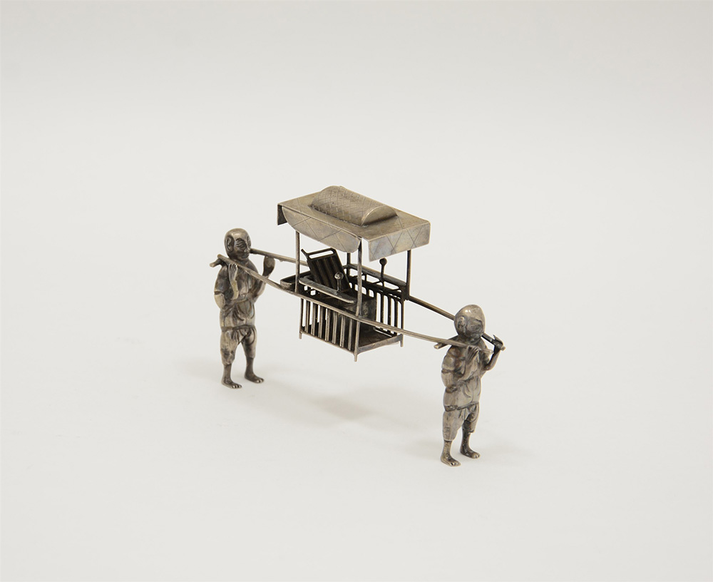 Miniatura in argento raffigurante asiatici con portantina. Cina, sec. XX (g...