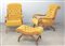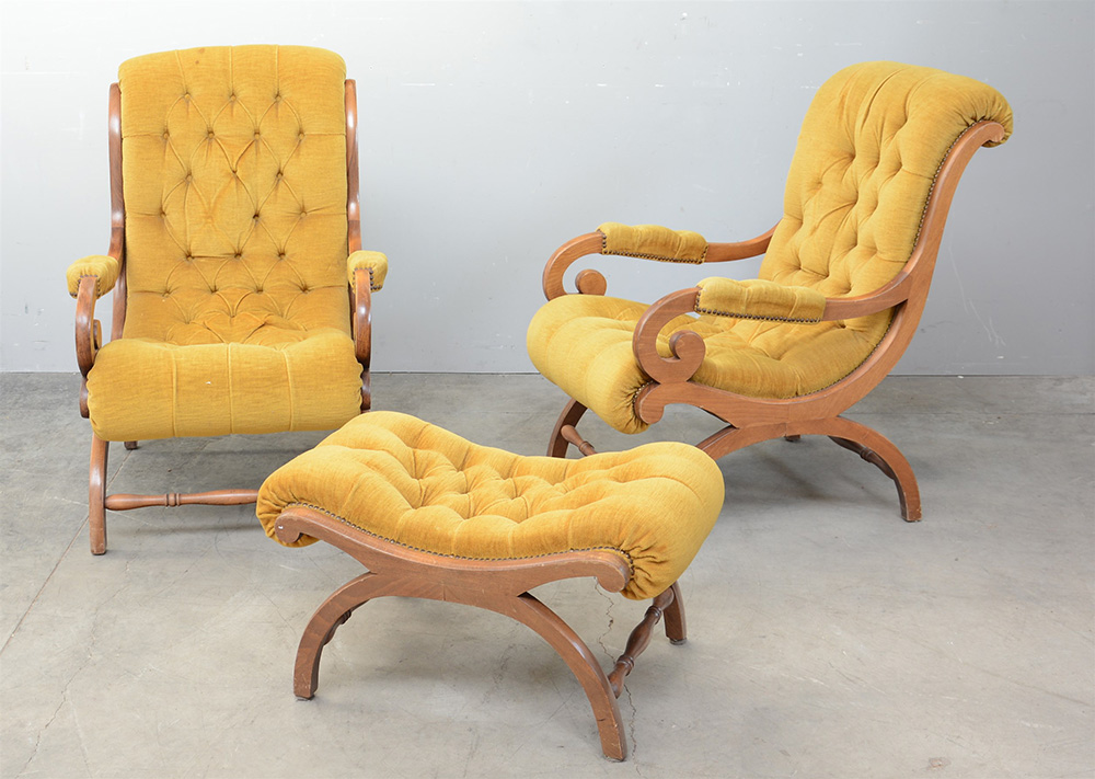 Coppia di poltrone e sgabello con montanti e braccioli sagomati, gambe mosse riunite da traverse tornite. Rivestite in tessuto giallo (difetti)