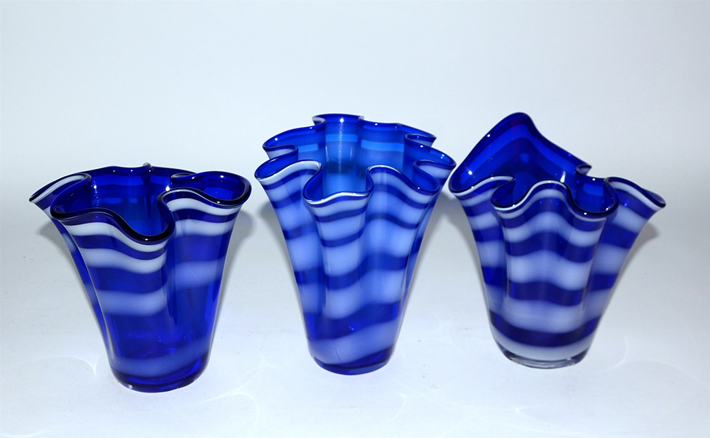 Lotto composto da tre vasi a fazzoletto in vetro blu decorato a striature (h...