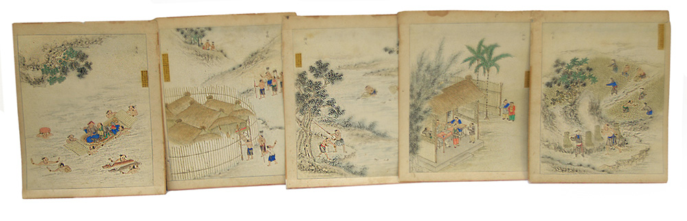 Dieci pagine di album, inchiostro e colore su carta raffiguranti scene di vita quotidiana con iscrizioni (difetti)