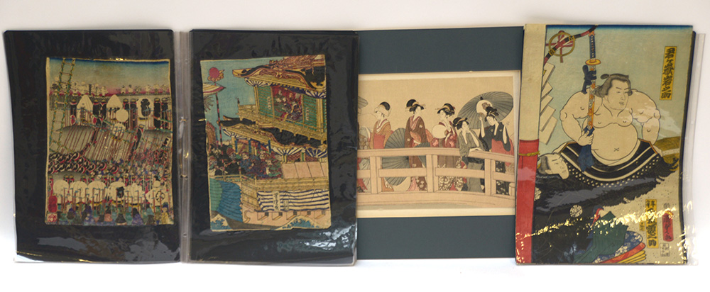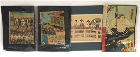 Gruppo di quattordici stampe giapponesi raffiguranti dame in paesaggio e lottatori di sumo (difetti)