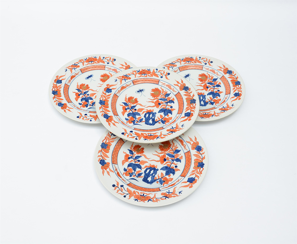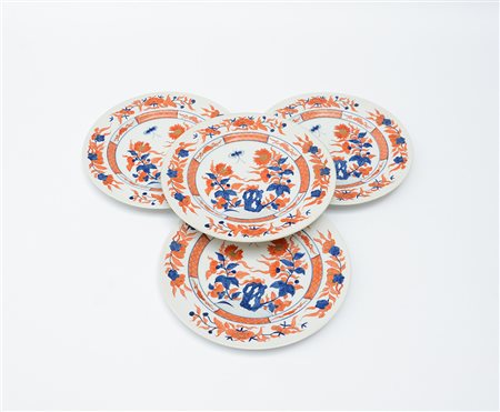 Gruppo di quattro piatti in stile Imari cinese con marchio apocrifo Qianlong (difetti)