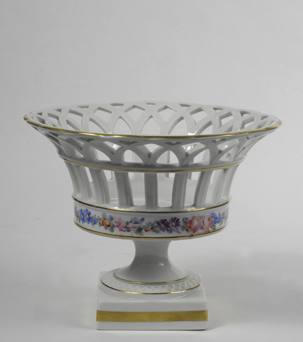 Cestino centrotavola in porcellana bianca traforata, con decorazioni in oro e fiori dipinti, marcato alla base N e corona, fine XIX sec., cm. h. 18. € 200/300