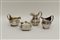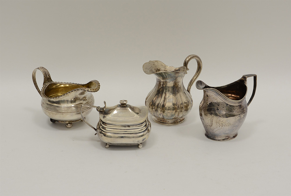 Lotto in argento composto da tre lattiere e una mostardiera. Inghilterra e Nord Europa, secolo XIX (gr tot. 500 ca.) (h. max cm 10) (difetti)