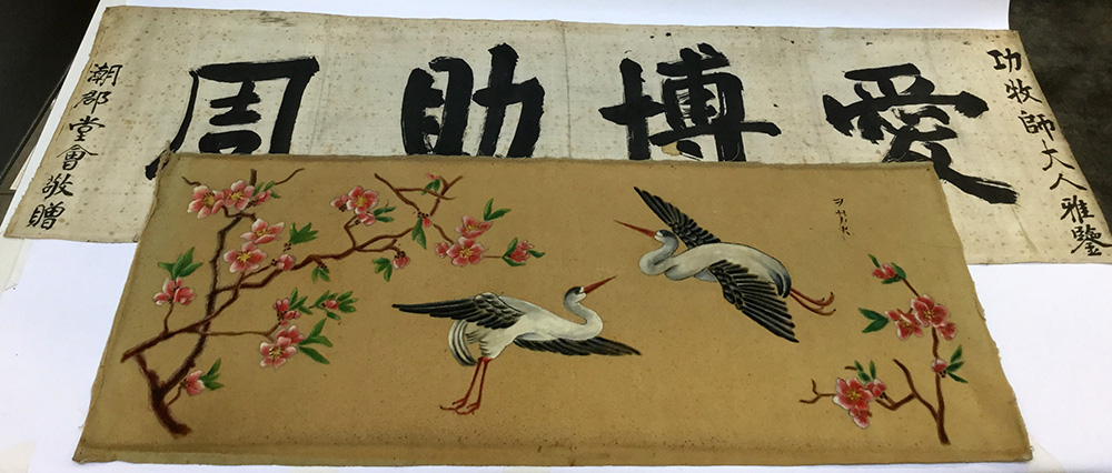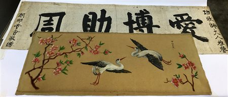 Lotto composto da un dipinto su stoffa raffigurante coppia di aironi. Giappone, sec. XX,