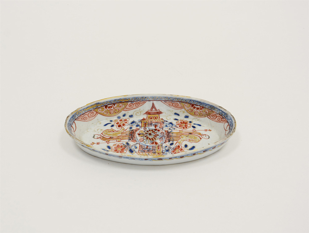 Piattino ovale in porcellana Imari da esportazione (qualche sbeccatura al bordo)