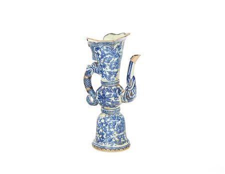 Versatoio dalla forma arcaica in porcellana bianca e blu. Marchio apocrifo sul fondo con montatura in metallo argentato (difetti)