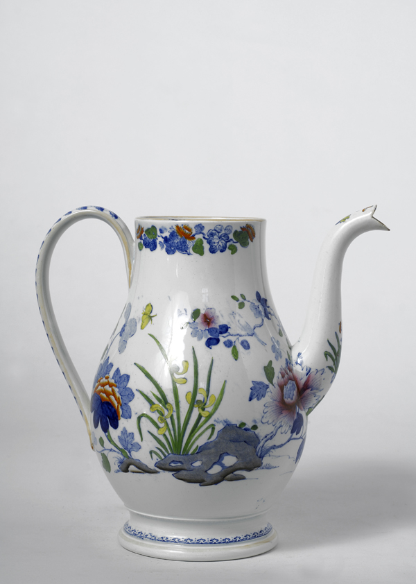 Teiera in ceramica, con decorazioni a stampo e dipinte a motivi floreali e farfalle, manifattura Wedgwood, metà XIX sec., marcata alla base, cm. h. 22,5. € 300/400