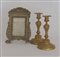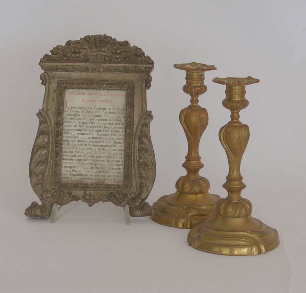 Lotto composto da una coppia di candelieri in bronzo e un cartagloria in metallo argentato