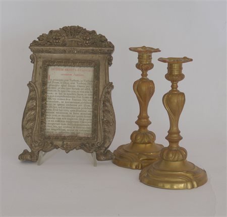 Lotto composto da una coppia di candelieri in bronzo e un cartagloria in...