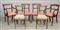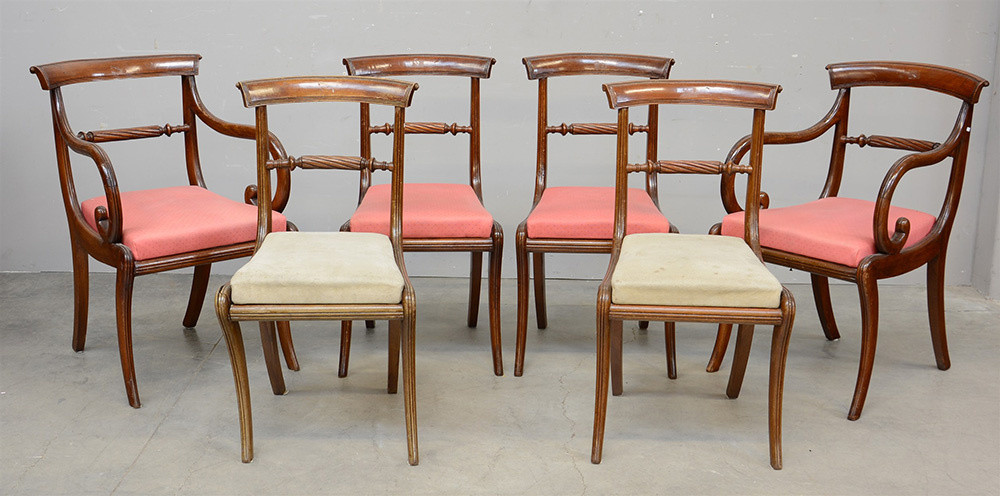 Gruppo di sei sedie, di cui due da capotavola con braccioli arricciati, gambe a sciabola e dorsali a giorno. Secolo XX (difetti)