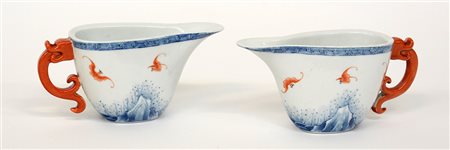 Due versatoi in porcellana bianca e blu e rosso ferro, con decoro di pipistrelli in volo su mare in tempesta, marchio apocrifo Qianlong alla base. Cina, sec. XX (l. 15 cm.)
