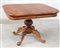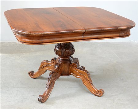 Tavolo quadrato allungabile in noce con gamba centrale intagliata a volute...