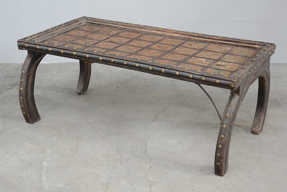 Tavolo da salotto orientale in legno decorato da applicazioni in ottone e ferro battuto (cm 120x49x66)(difetti)