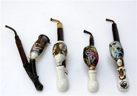 Manifattura tedesca, lotto di quattro pipe con fornelli in ceramica dipinta: due a soggetto militare, una con effigi dell'imperatore Carlo d'Austria e consorte ed una raffigurante Leda e il cigno (difetti, mancanze e restauri)