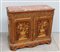 Credenza lastronata con fronte a due ante intarsiata con vasi fiori e foglie, interamente decorate con applicazioni in bronzo dorato a motivi vegetali. Piedi a mensola. Piano in marmo (cm 110x96x48)(difetti)