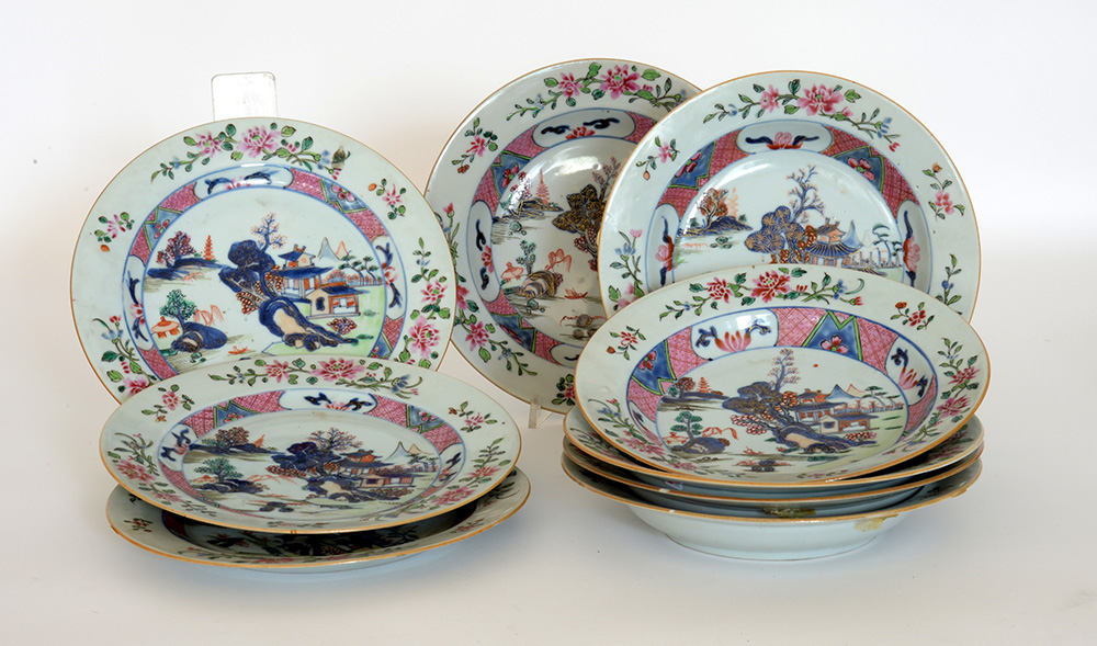 Gruppo di nove piatti in porcellana Famiglia Rosa con scene di paesaggio (difetti)