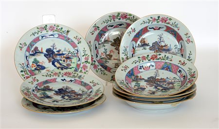Gruppo di nove piatti in porcellana Famiglia Rosa con scene di paesaggio...