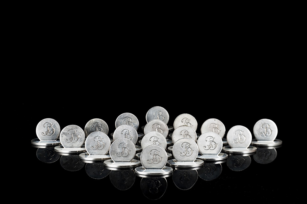 Diciotto segnaposto in argento di forma circolare su base ovale, con lettera 'B' incisa. Italia, secolo XX (lungh. cm 4) (g tot. 140 ca.)