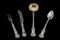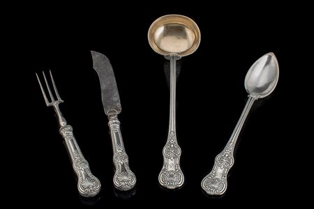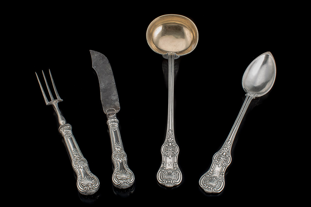 Quattro posate da portata in argento, con aderenze in ferro, con manici decorati a volute fogliate e conchiglia; monogramma inciso. Regno delle Due Sicilie, Napoli, 1832-73. Secolo XIX (g tot. stimati 600 ca.) (lievi difetti)