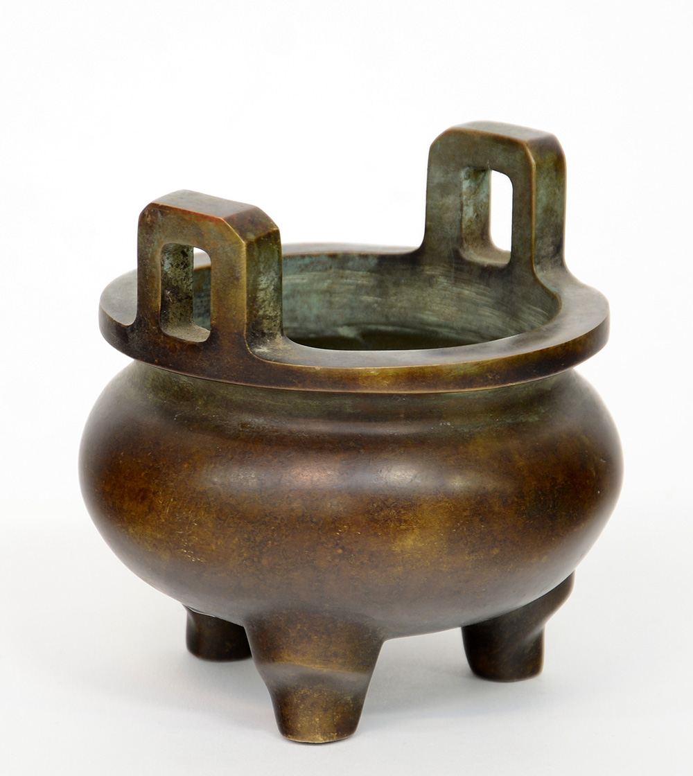 Incensiere tripode in bronzo, marchio apocrifo Xuande alla base. Cina, sec. XX (h. 10,5 cm.)