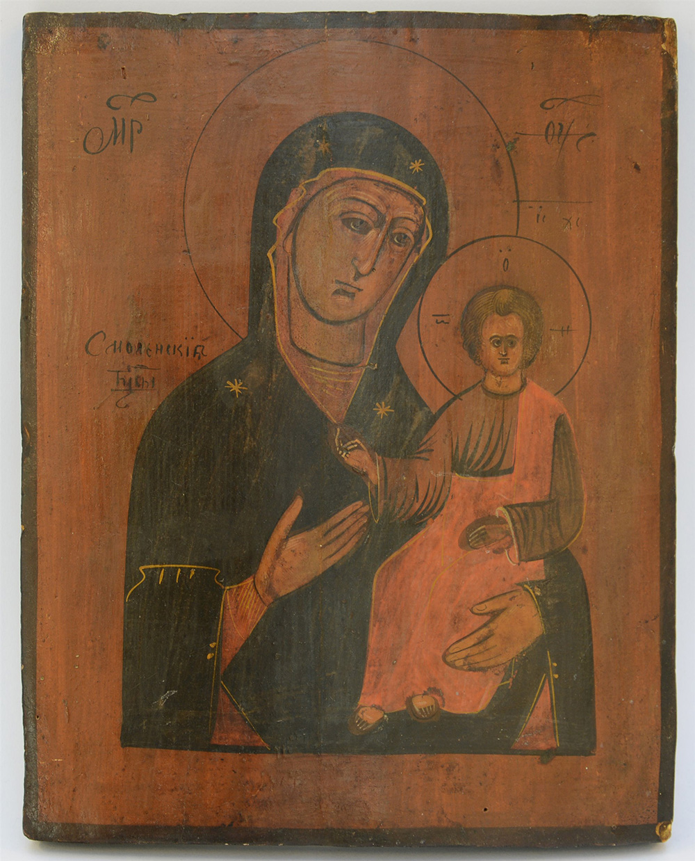 Icona russa raffigurante Madonna con bambino (cm 32x20) sec. XX (difetti)