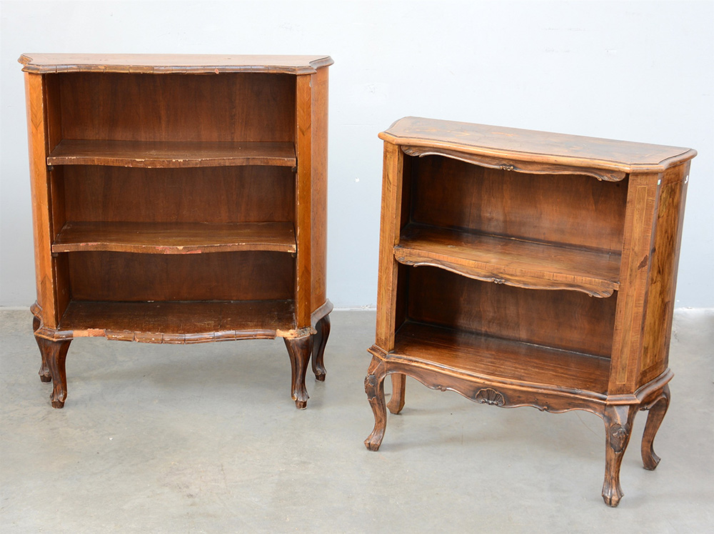 Coppia di libreriette a giorno in stile settecentesco lastronate in noce e radica e filettate, gambe sagomate e intagliate (cm 73x80x28 e cm 84x93x28)(difetti e mancanze)