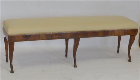Panca lastronata in noce. Gambe anteriori intagliate a volute. Sec. XIX