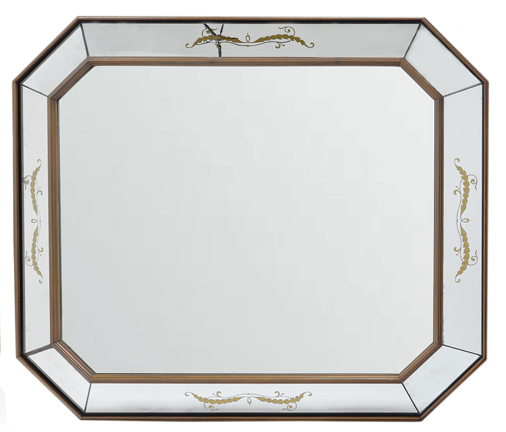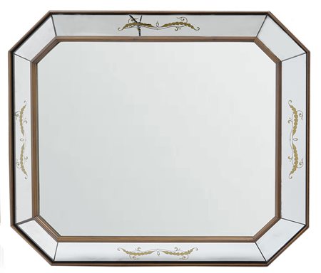 Specchiera rettangolare con cornice in legno con decori dorati a foglie d’acanto. Esecuzione italiana, anni 40 (cm 128x113)(difetti)