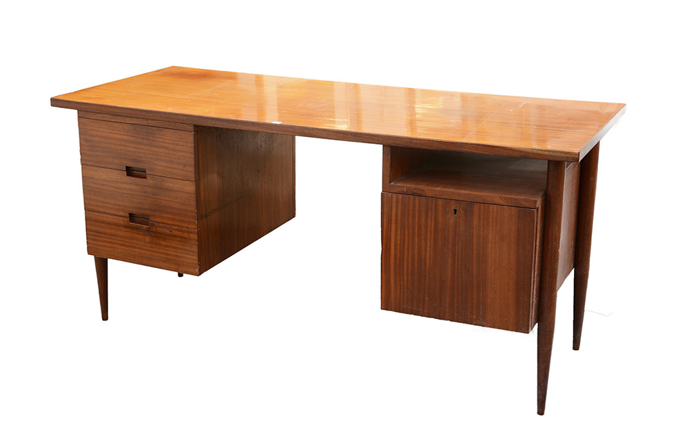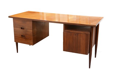 Scrivania da centro dotata di cassettiera, di stipo portalibri e di piano a ribalta, produzione italiana anni '50 (cm 150x65x75) (lievi difetti)
