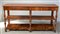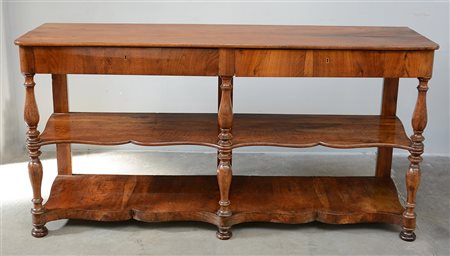 Grande consolle lastronata in noce con due cassetti nella fascia, montanti torniti e piani inferiori sagomati (cm 202x102x56) (difetti e restauri)