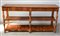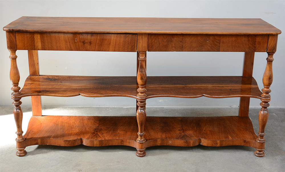 Grande consolle lastronata in noce con due cassetti nella fascia, montanti torniti e piani inferiori sagomati (cm 202x102x56) (difetti e restauri)