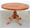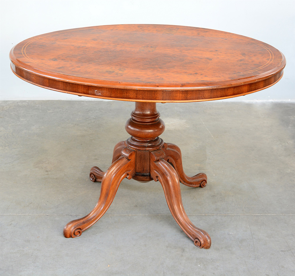 Tavolo tondo con piano lastronato in radica e filettato, sostegno tornito con quattro gambe desinenti a ricciolo (cm 118x78x116) (difetti)
