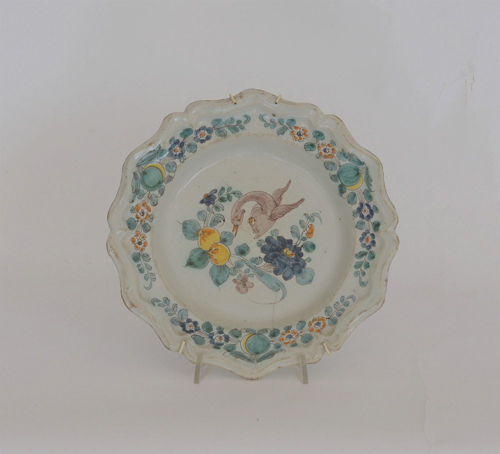 Piatto in ceramica decorato al centro con volatile, fiori e frutta e bordo sagomato. Sec. XIX ( d. cm 29) (mancanze e felature)