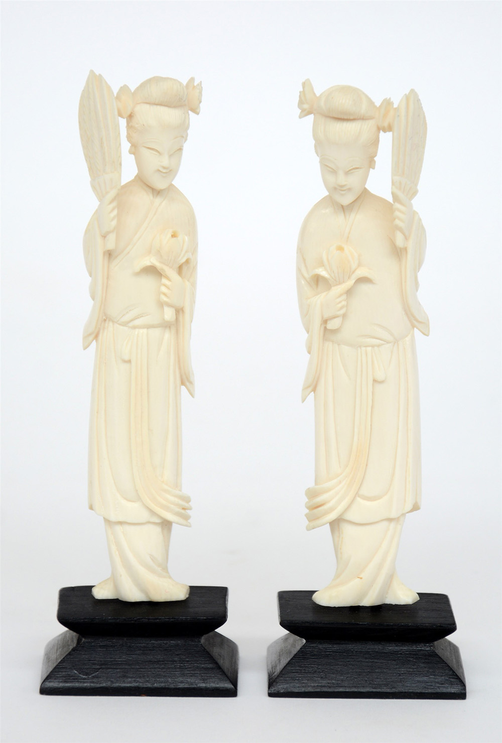 Coppia di figure in osso raffiguranti dame con ventaglio (lievi difetti) Cina, sec. XX (h. 12,5 cm.)
