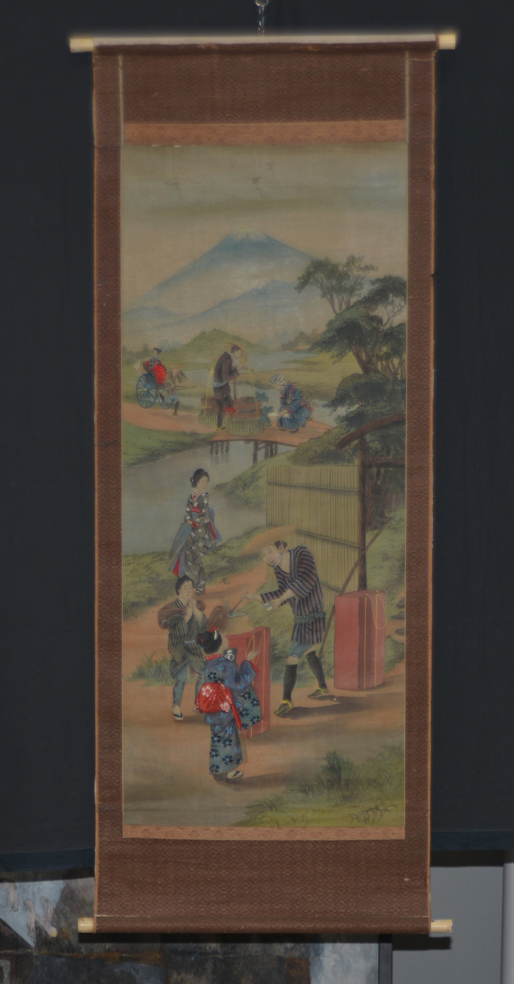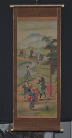Inchiostro e colore su seta. Scroll raffigurante paesaggio giapponese, risaie e monte Fuji, montatura in seta (difetti)