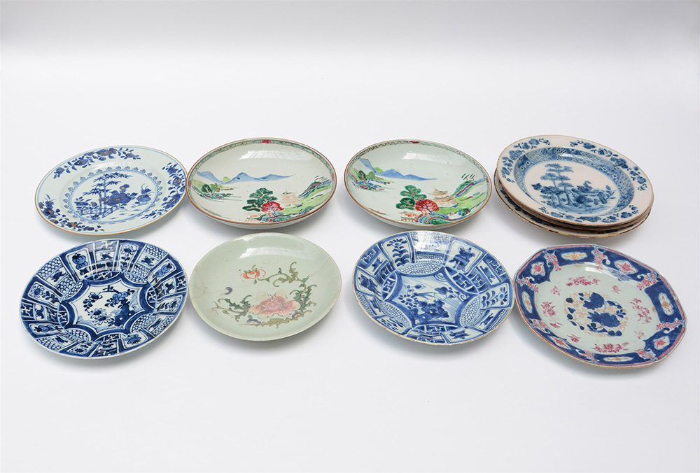 Dieci piatti in porcellana decorata, varie misure (difetti e restauri)