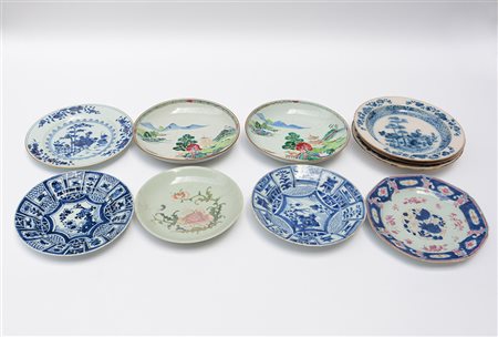 Dieci piatti in porcellana decorata, varie misure (difetti e restauri)(d. max...