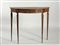 Consolle listrata in noce, piano sagomato, un cassetto sulla fascia, gambe a piramide, cm. 88x99x35 € 200/300