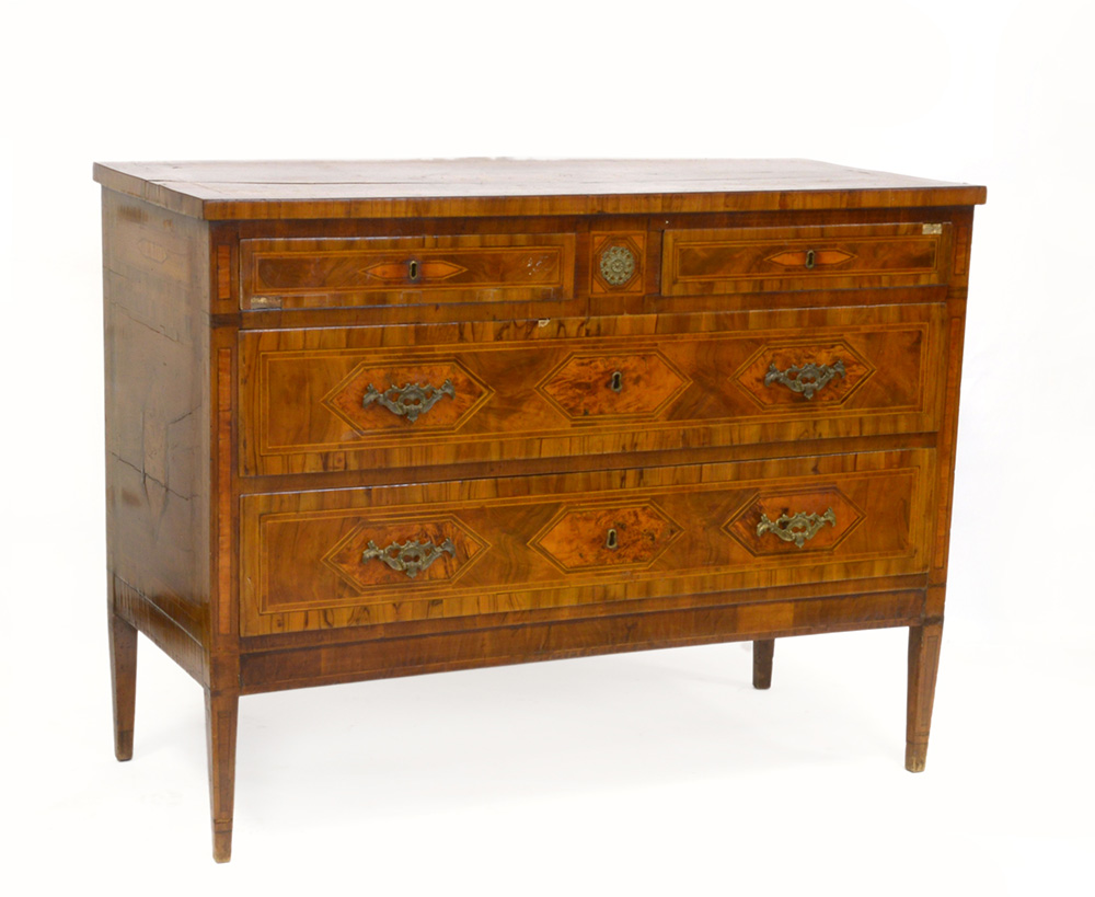 Cassettone a due cassetti grandi e un sottopiano, lastronato in noce e radica e filettato in legno chiaro. Sec. XVIII (difetti e restauri)