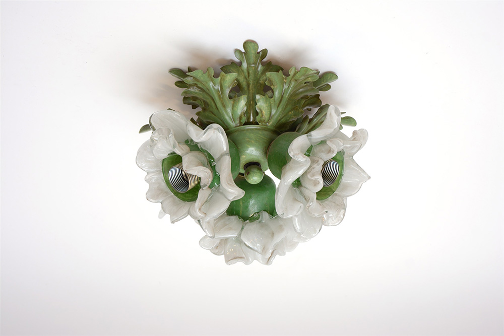 Piccola plafoniera a tre luci a forma di fiore in vetro incolore, lattimo, verde. (h cm 18) (lievi difetti)