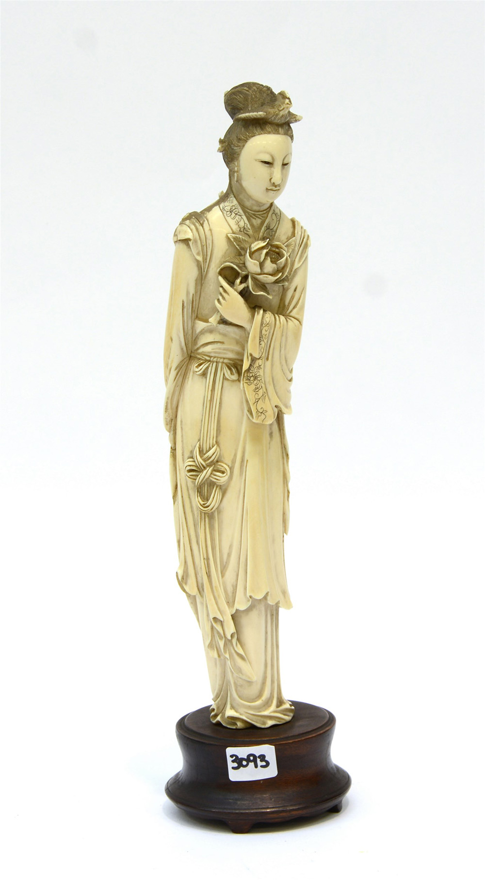 Scultura in avorio raffigurante dama dalle lunghe vesti con elaborata acconciatura e fiore di peonia, con base in legno (difetti e mancanze)